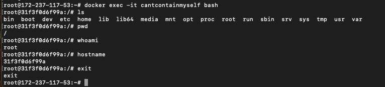 docker exec -it cantcontainmyself bash