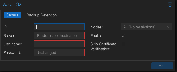Complete each section with a ID(name), IP Address or Hostname, Username (for the ESXi host) and Password and click Add